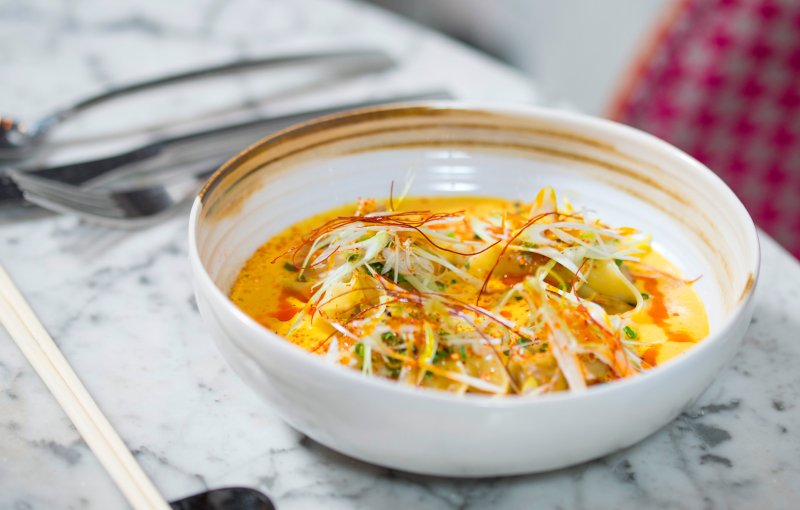 Dim sum al vapor, servidos con una espuma Thailandesa a base de lemon grass y curry.