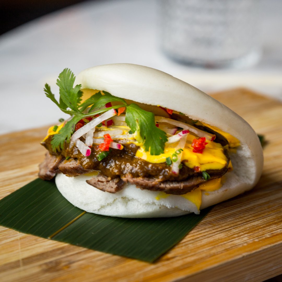 Panecillo de harina de trigo cocido al vapor, relleno de pato confitado.